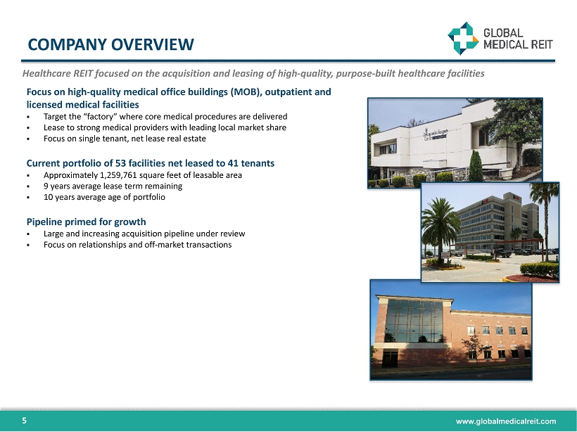 www.globalmedicalreit.com LEADERSHIP 4 ▪ Over 30 years of experience in financial accounting, reporting and management, including extensive experience in SEC reportin g a nd Sarbanes - Oxley compliance ▪ Served as the Senior Vice President, Controller and Chief Accounting Officer of FBR & Co. (“FBR” NASDAQ: FBRC) beginning in O cto ber 2007 ▪ Prior role as Senior Vice President, Controller and Chief Accounting Officer of Arlington Asset Investment Corp. (NYSE: AI) ▪ Previously Senior Manager in the assurance practice at Ernst & Young ▪ Over 17 years of experience in real estate finance and has completed $ 3 billion of transactions ▪ Prior experience as principal at investment advisor to pension funds and investment banker representing healthcare systems, developers and REITs ▪ Healthcare real estate investment banker for Cain Brothers DANICA HOLLEY, Chief Operating Officer ALFONZO LEON , Chief Investment Officer ▪ Over 20 years of experience in healthcare, real estate development, management and investment ▪ Former assistant to the U.S. Secretary of Housing & Urban Development ▪ United States Special Representative to United Nations in Geneva ▪ Developed large - scale residential, commercial, hospitality and retail properties ▪ Management and business development experience spans more than 18 years ▪ More than a decade of experience managing multinational teams for complex service delivery across disciplines ▪ More than 8 years in healthcare programs and infrastructure as Executive Director of Safe Blood International ROBERT KIERNAN , Chief Financial Officer and Treasurer JEFFREY BUSCH , Chairman, Chief Executive Officer and President JAMIE BARBER, General Counsel and Corporate Secretary ALLEN WEBB, Senior Vice President, SEC Reporting and Technical Accounting ▪ Over 25 years of experience in SEC reporting and compliance ▪ Previously worked within the SEC’s Division of Corporation Finance, Real Estate industry group. ▪ Previously served as manager in the assurance practice of Arthur Andersen, focused primarily on Real Estate industry clients ▪ More than a decade of experience with SEC compliance and reporting matters, corporate governance, investment banking and REIT - re lated capital markets ▪ Served as Associate General Counsel of FBR (NASDAQ: FBRC) beginning in July 2012 ▪ Prior role as Senior Associate – REIT Capital Markets at Hunton & Williams LLP, where he represented public REITs in conjunction with their SEC compliance requirements, corporate governance matters, offerings of equity and debt securities and merger and acquisition transactions ▪ Previously with Sullivan & Cromwell LLP and KPMG