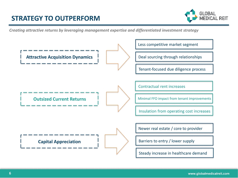 www.globalmedicalreit.com COMPANY OVERVIEW 5 Healthcare REIT focused on the acquisition and leasing of high - quality, purpose - built healthcare facilities Focus on high - quality medical office buildings (MOB), outpatient and licensed medical facilities ▪ Target the “factory” where core medical procedures are delivered ▪ Lease to strong medical providers with leading local market share ▪ Focus on single tenant, net lease real estate Current portfolio of 53 facilities net leased to 41 tenants ▪ Approximately 1,259,761 square feet of leasable area ▪ 9 years average lease term remaining ▪ 10 years average age of portfolio Pipeline primed for growth ▪ Large and increasing acquisition pipeline under review ▪ Focus on relationships and off - market transactions