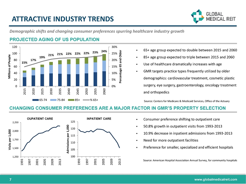 www.globalmedicalreit.com STRATEGY TO OUTPERFORM 6 Creating attractive returns by leveraging management expertise and differentiated investment strategy Attractive Acquisition Dynamics Outsized Current Returns Capital Appreciation Less competitive market segment Deal sourcing through relationships Tenant - focused due diligence process Contractual rent increases Minimal FFO impact from tenant improvements Insulation from operating cost increases Newer real estate / core to provider Barriers to entry / lower supply Steady increase in healthcare demand