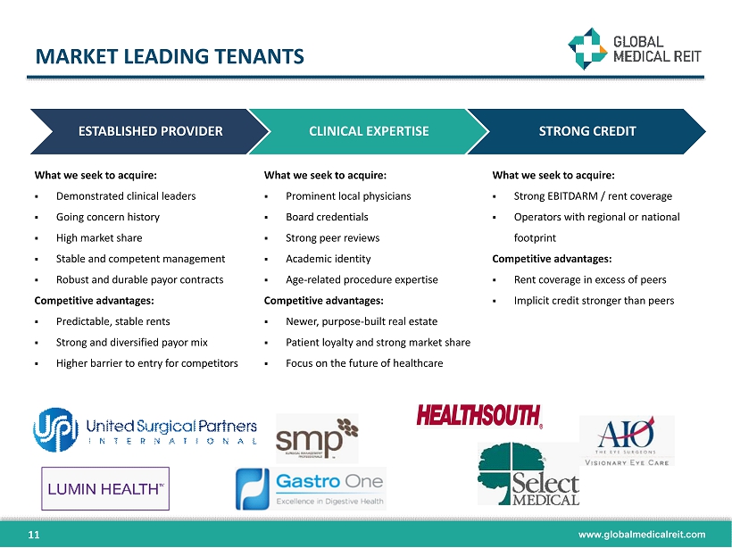 www.globalmedicalreit.com MARKET LEADING TENANTS ESTABLISHED PROVIDER CLINICAL EXPERTISE STRONG CREDIT 11 What we seek to acquire: ▪ Demonstrated clinical leaders ▪ Going concern history ▪ High market share ▪ Stable and competent management ▪ Robust and durable payor contracts Competitive advantages: ▪ Predictable, stable rents ▪ Strong and diversified payor mix ▪ Higher barrier to entry for competitors What we seek to acquire: ▪ Prominent local physicians ▪ Board credentials ▪ Strong peer reviews ▪ Academic identity ▪ Age - related procedure expertise Competitive advantages: ▪ Newer, purpose - built real estate ▪ Patient loyalty and strong market share ▪ Focus on the future of healthcare What we seek to acquire: ▪ Strong EBITDARM / rent coverage ▪ Operators with regional or national footprint Competitive advantages: ▪ Rent coverage in excess of peers ▪ Implicit credit stronger than peers