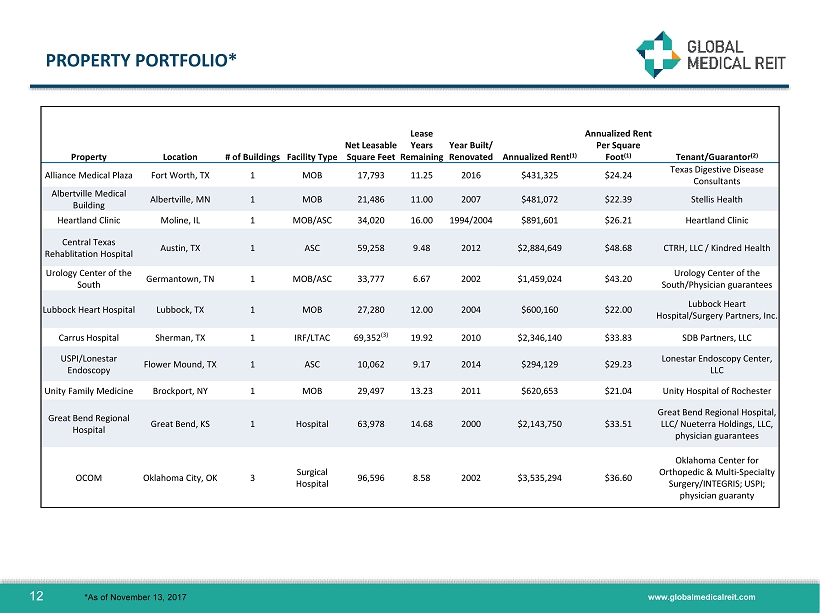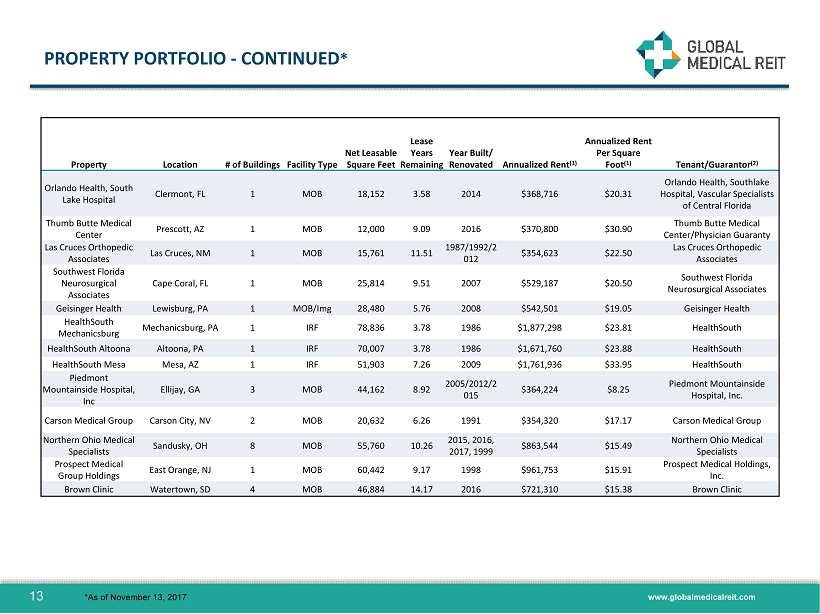 www.globalmedicalreit.com PROPERTY PORTFOLIO* 11 *As of November 13, 2017 12 Property Location # of Buildings Facility Type Net Leasable Square Feet Lease Years Remaining Year Built/ Renovated Annualized Rent (1) Annualized Rent Per Square Foot (1) Tenant/Guarantor (2) Alliance Medical Plaza Fort Worth, TX 1 MOB 17,793 11.25 2016 $431,325 $24.24 Texas Digestive Disease Consultants Albertville Medical Building Albertville, MN 1 MOB 21,486 11.00 2007 $481,072 $22.39 Stellis Health Heartland Clinic Moline, IL 1 MOB/ASC 34,020 16.00 1994/2004 $891,601 $26.21 Heartland Clinic Central Texas Rehablitation Hospital Austin, TX 1 ASC 59,258 9.48 2012 $2,884,649 $48.68 CTRH, LLC / Kindred Health Urology Center of the South Germantown, TN 1 MOB/ASC 33,777 6.67 2002 $1,459,024 $43.20 Urology Center of the South/Physician guarantees Lubbock Heart Hospital Lubbock, TX 1 MOB 27,280 12.00 2004 $600,160 $22.00 Lubbock Heart Hospital/Surgery Partners, Inc. Carrus Hospital Sherman, TX 1 IRF/LTAC 69,352 (3) 19.92 2010 $2,346,140 $33.83 SDB Partners, LLC USPI/Lonestar Endoscopy Flower Mound, TX 1 ASC 10,062 9.17 2014 $294,129 $29.23 Lonestar Endoscopy Center, LLC Unity Family Medicine Brockport, NY 1 MOB 29,497 13.23 2011 $620,653 $21.04 Unity Hospital of Rochester Great Bend Regional Hospital Great Bend, KS 1 Hospital 63,978 14.68 2000 $2,143,750 $33.51 Great Bend Regional Hospital, LLC/ Nueterra Holdings, LLC, physician guarantees OCOM Oklahoma City, OK 3 Surgical Hospital 96,596 8.58 2002 $3,535,294 $36.60 Oklahoma Center for Orthopedic & Multi - Specialty Surgery/INTEGRIS; USPI; physician guaranty