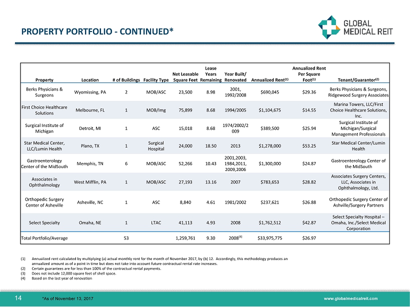 www.globalmedicalreit.com PROPERTY PORTFOLIO - CONTINUED * 12 *As of November 13, 2017 13 Property Location # of Buildings Facility Type Net Leasable Square Feet Lease Years Remaining Year Built/ Renovated Annualized Rent (1) Annualized Rent Per Square Foot (1) Tenant/Guarantor (2) Orlando Health, South Lake Hospital Clermont, FL 1 MOB 18,152 3.58 2014 $368,716 $20.31 Orlando Health, Southlake Hospital, Vascular Specialists of Central Florida Thumb Butte Medical Center Prescott, AZ 1 MOB 12,000 9.09 2016 $370,800 $30.90 Thumb Butte Medical Center/Physician Guaranty Las Cruces Orthopedic Associates Las Cruces, NM 1 MOB 15,761 11.51 1987/1992/2 012 $354,623 $22.50 Las Cruces Orthopedic Associates Southwest Florida Neurosurgical Associates Cape Coral, FL 1 MOB 25,814 9.51 2007 $529,187 $20.50 Southwest Florida Neurosurgical Associates Geisinger Health Lewisburg, PA 1 MOB/Img 28,480 5.76 2008 $542,501 $19.05 Geisinger Health HealthSouth Mechanicsburg Mechanicsburg, PA 1 IRF 78,836 3.78 1986 $1,877,298 $23.81 HealthSouth HealthSouth Altoona Altoona, PA 1 IRF 70,007 3.78 1986 $1,671,760 $23.88 HealthSouth HealthSouth Mesa Mesa, AZ 1 IRF 51,903 7.26 2009 $1,761,936 $33.95 HealthSouth Piedmont Mountainside Hospital, Inc Ellijay, GA 3 MOB 44,162 8.92 2005/2012/2 015 $364,224 $8.25 Piedmont Mountainside Hospital, Inc. Carson Medical Group Carson City, NV 2 MOB 20,632 6.26 1991 $354,320 $17.17 Carson Medical Group Northern Ohio Medical Specialists Sandusky, OH 8 MOB 55,760 10.26 2015, 2016, 2017, 1999 $863,544 $15.49 Northern Ohio Medical Specialists Prospect Medical Group Holdings East Orange, NJ 1 MOB 60,442 9.17 1998 $961,753 $15.91 Prospect Medical Holdings, Inc. Brown Clinic Watertown, SD 4 MOB 46,884 14.17 2016 $721,310 $15.38 Brown Clinic