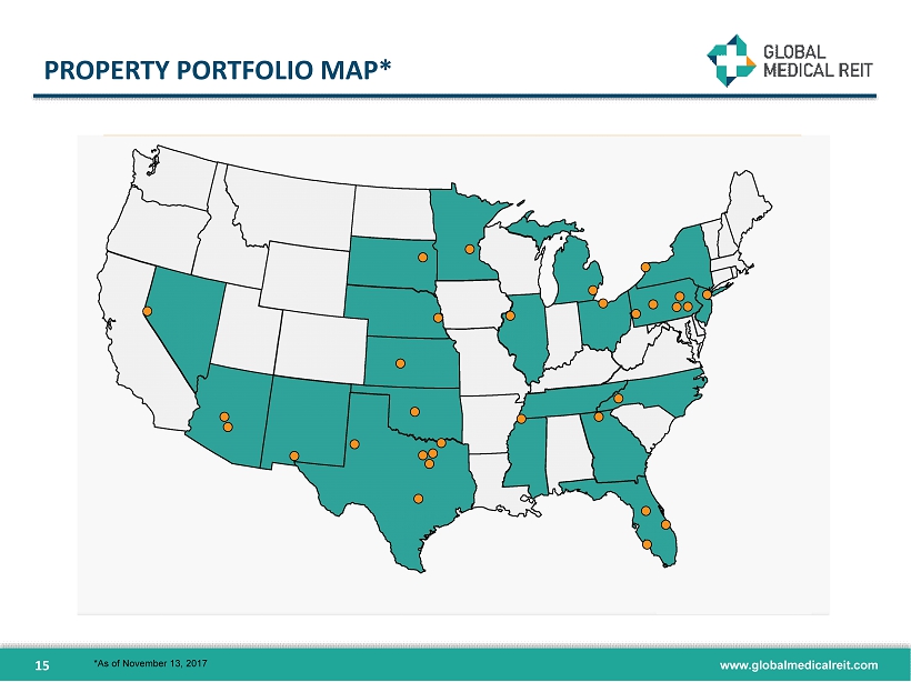 www.globalmedicalreit.com PROPERTY PORTFOLIO - CONTINUED* (1) Annualized rent calculated by multiplying (a) actual monthly rent for the month of November 2017, by (b) 12. Accordingly, this methodology produces an annualized amount as of a point in time but does not take into account future contractual rental rate increases. (2) Certain guarantees are for less than 100% of the contractual rental payments. (3) Does not include 12,000 square feet of shell space. (4) Based on the last year of renovation *As of November 13, 2017 14 Property Location # of Buildings Facility Type Net Leasable Square Feet Lease Years Remaining Year Built/ Renovated Annualized Rent (1) Annualized Rent Per Square Foot (1) Tenant/Guarantor (2) Berks Physicians & Surgeons Wyomissing, PA 2 MOB/ASC 23,500 8.98 2001, 1992/2008 $690,045 $29.36 Berks Physicians & Surgeons, Ridgewood Surgery Associates First Choice Healthcare Solutions Melbourne, FL 1 MOB/Img 75,899 8.68 1994/2005 $1,104,675 $14.55 Marina Towers, LLC/First Choice Healthcare Solutions, Inc. Surgical Institute of Michigan Detroit, MI 1 ASC 15,018 8.68 1974/2002/2 009 $389,500 $25.94 Surgical Institute of Michigan/Surgical Management Professionals Star Medical Center, LLC/Lumin Health Plano, TX 1 Surgical Hospital 24,000 18.50 2013 $1,278,000 $53.25 Star Medical Center/Lumin Health Gastroenterology Center of the MidSouth Memphis, TN 6 MOB/ASC 52,266 10.43 2001,2003, 1984,2011, 2009,2006 $1,300,000 $24.87 Gastroenterology Center of the MidSouth Associates in Ophthalmology West Mifflin, PA 1 MOB/ASC 27,193 13.16 2007 $783,653 $28.82 Associates Surgery Centers, LLC, Associates in Ophthalmology, Ltd. Orthopedic Surgery Center of Asheville Asheville, NC 1 ASC 8,840 4.61 1981/2002 $237,621 $26.88 Orthopedic Surgery Center of Ashville/Surgery Partners Select Specialty Omaha, NE 1 LTAC 41,113 4.93 2008 $1,762,512 $42.87 Select Specialty Hospital – Omaha, Inc./Select Medical Corporation Total Portfolio/Average 53 1,259,761 9.30 2008 (4) $33,975,775 $26.97