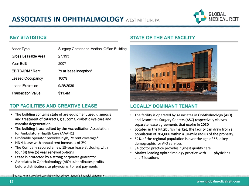 www.globalmedicalreit.com ASSOCIATES IN OPHTHALMOLOGY WEST MIFFLIN, PA KEY STATISTICS STATE OF THE ART FACILITY TOP FACILITIES AND CREATIVE LEASE LOCALLY DOMINANT TENANT • The building contains state of are equipment used diagnosis and treatment of cataracts, glaucoma, diabetic eye care and macular degeneration • The building is accredited by the Accreditation Association for Ambulatory Health Care (AAAHC) • Profitable operator provides high, 7x rent coverage* • NNN Lease with annual rent increases of 2% • The Company secured a new 15 - year lease at closing with four (4) five (5) year renewal options • Lease is protected by a strong corporate guarantor • Associates in Ophthalmology (AIO) subordinates profits before distributions to physicians, to rent payments • The facility is operated by Associates in Ophthalmology (AIO) and Associates Surgery Centers (ASC) respectively via two separate lease agreements that expire in 2030 • Located in the Pittsburgh market, the facility can draw from a population of 764,000 within a 10 - mile radius of the property. • 32% of the regional population is over the age of 55, a key demographic for AIO services • 34 doctor practice provides highest quality care • Market - leading ophthalmology practice with 11+ physicians and 7 locations 17 Asset Type Surgery Center and Medical Office Building Gross Leasable Area 27,193 Year Built 2007 EBITDARM / Rent 7x at lease inception* Leased Occupancy 100% Lease Expiration 9/25/2030 Transaction Value $11.4M *Source: tenant - provided calculations based upon tenant’s financial statements.