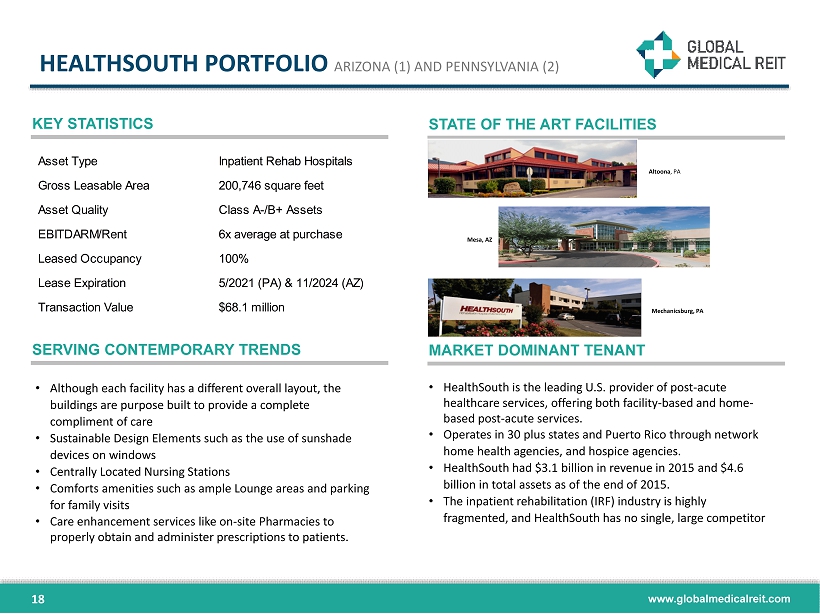 www.globalmedicalreit.com • Although each facility has a different overall layout, the buildings are purpose built to provide a complete compliment of care • Sustainable Design Elements such as the use of sunshade devices on windows • Centrally Located Nursing Stations • Comforts amenities such as ample Lounge areas and parking for family visits • Care enhancement services like on - site Pharmacies to properly obtain and administer prescriptions to patients. HEALTHSOUTH PORTFOLIO ARIZONA (1) AND PENNSYLVANIA (2) KEY STATISTICS STATE OF THE ART FACILITIES SERVING CONTEMPORARY TRENDS MARKET DOMINANT TENANT • HealthSouth is the leading U.S. provider of post - acute healthcare services, offering both facility - based and home - based post - acute services. • Operates in 30 plus states and Puerto Rico through network home health agencies, and hospice agencies. • HealthSouth had $3.1 billion in revenue in 2015 and $4.6 billion in total assets as of the end of 2015. • The inpatient rehabilitation (IRF) industry is highly fragmented, and HealthSouth has no single, large competitor 18 Asset Type Inpatient Rehab Hospitals Gross Leasable Area 200,746 square feet Asset Quality Class A-/B+ Assets EBITDARM/Rent 6x average at purchase Leased Occupancy 100% Lease Expiration 5/2021 (PA) & 11/2024 (AZ) Transaction Value $68.1 million Altoona , PA Mechanicsburg, PA Mesa, AZ