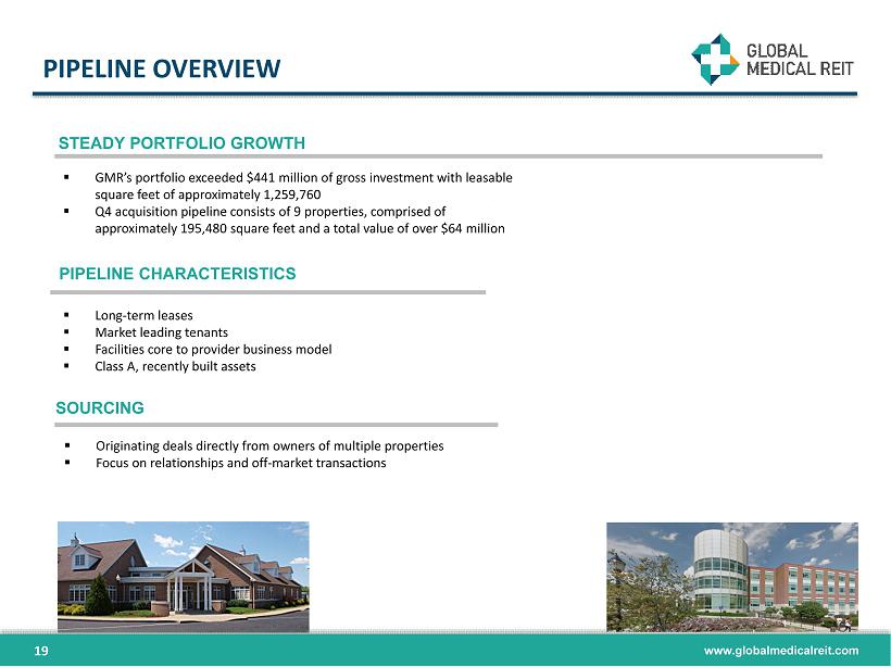 www.globalmedicalreit.com PIPELINE OVERVIEW STEADY PORTFOLIO GROWTH ▪ GMR’s portfolio exceeded $441 million of gross investment with leasable square feet of approximately 1,259,760 ▪ Q4 acquisition pipeline consists of 9 properties, comprised of approximately 195,480 square feet and a total value of over $64 million PIPELINE CHARACTERISTICS ▪ Long - term leases ▪ Market leading tenants ▪ Facilities core to provider business model ▪ Class A, recently built assets ▪ Originating deals directly from owners of multiple properties ▪ Focus on relationships and off - market transactions SOURCING 19 East Orange, NJ*