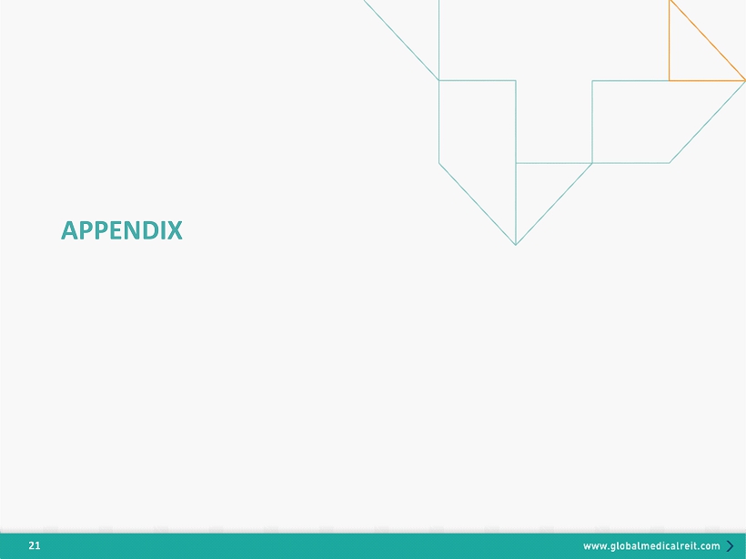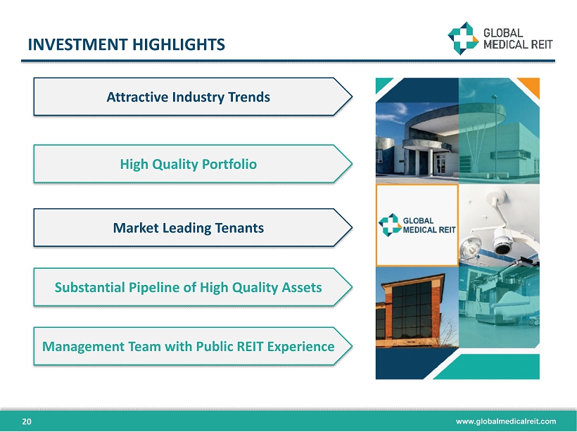 www.globalmedicalreit.com INVESTMENT HIGHLIGHTS Management Team with Public REIT Experience Attractive Industry Trends Market Leading Tenants High Quality Portfolio Substantial Pipeline of High Quality Assets 20