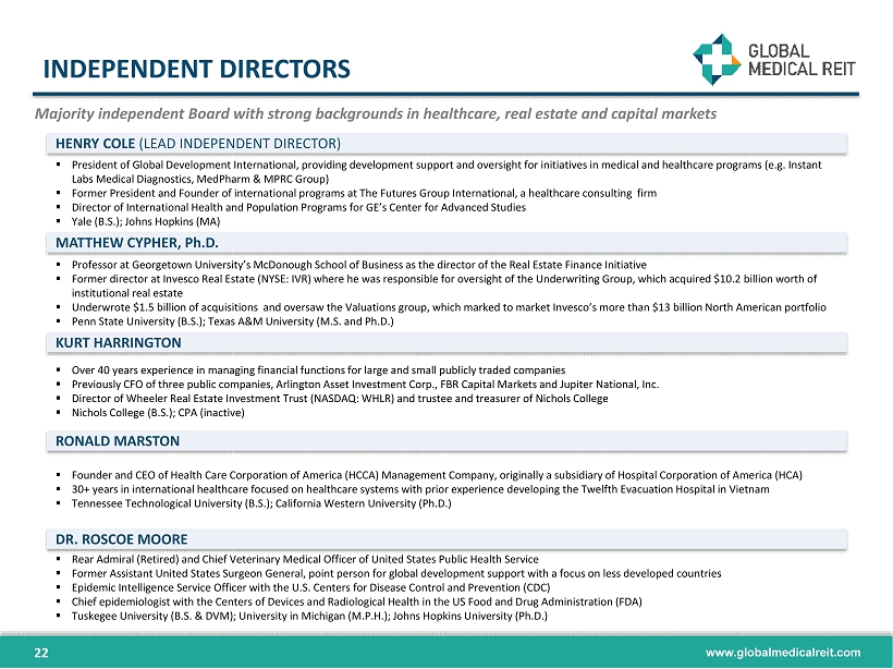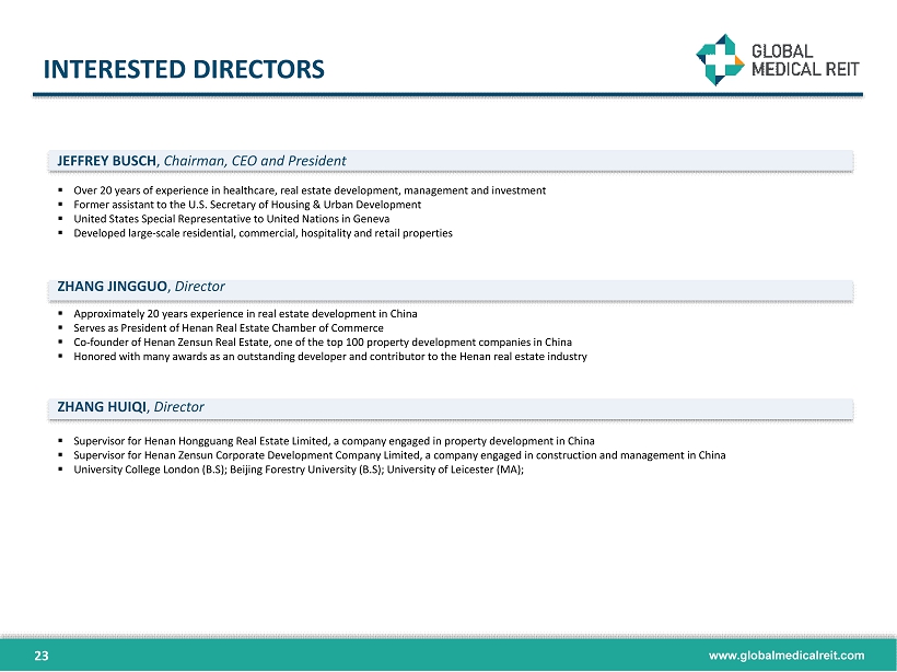 www.globalmedicalreit.com INDEPENDENT DIRECTORS 22 ▪ President of Global Development International, providing development support and oversight for initiatives in medical and hea lth care programs (e.g. Instant Labs Medical Diagnostics, MedPharm & MPRC Group) ▪ Former President and Founder of international programs at The Futures Group International, a healthcare consulting firm ▪ Director of International Health and Population Programs for GE’s Center for Advanced Studies ▪ Yale (B.S.); Johns Hopkins (MA) ▪ Professor at Georgetown University’s McDonough School of Business as the director of the Real Estate Finance Initiative ▪ Former director at Invesco Real Estate (NYSE: IVR) where he was responsible for oversight of the Underwriting Group, which ac qui red $10.2 billion worth of institutional real estate ▪ Underwrote $1.5 billion of acquisitions and oversaw the Valuations group, which marked to market Invesco’s more than $13 bil lio n North American portfolio ▪ Penn State University (B.S.); Texas A&M University (M.S. and Ph.D.) ▪ Over 40 years experience in managing financial functions for large and small publicly traded companies ▪ Previously CFO of three public companies, Arlington Asset Investment Corp . , FBR Capital Markets and Jupiter National, Inc . ▪ Director of Wheeler Real Estate Investment Trust (NASDAQ : WHLR) and trustee and treasurer of Nichols College ▪ Nichols College (B . S . ) ; CPA (inactive) ▪ Founder and CEO of Health Care Corporation of America (HCCA) Management Company, originally a subsidiary of Hospital Corporation of America (HCA) ▪ 30 + years in international healthcare focused on healthcare systems with prior experience developing the Twelfth Evacuation Hospital in Vietnam ▪ Tennessee Technological University (B . S . ) ; California Western University (Ph . D . ) HENRY COLE (LEAD INDEPENDENT DIRECTOR) MATTHEW CYPHER, Ph.D. KURT HARRINGTON RONALD MARSTON ▪ Rear Admiral (Retired) and Chief Veterinary Medical Officer of United States Public Health Service ▪ Former Assistant United States Surgeon General, point person for global development support with a focus on less developed countries ▪ Epidemic Intelligence Service Officer with the U . S . Centers for Disease Control and Prevention (CDC) ▪ Chief epidemiologist with the Centers of Devices and Radiological Health in the US Food and Drug Administration (FDA) ▪ Tuskegee University (B . S . & DVM) ; University in Michigan (M . P . H . ) ; Johns Hopkins University (Ph . D . ) DR. ROSCOE MOORE Majority independent Board with strong backgrounds in healthcare, real estate and capital markets