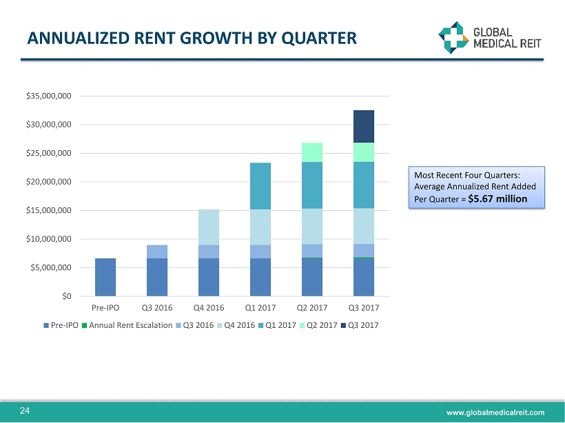 www.globalmedicalreit.com ANNUALIZED RENT GROWTH BY QUARTER $0 $5,000,000 $10,000,000 $15,000,000 $20,000,000 $25,000,000 $30,000,000 $35,000,000 Pre-IPO Q3 2016 Q4 2016 Q1 2017 Q2 2017 Q3 2017 Pre-IPO Annual Rent Escalation Q3 2016 Q4 2016 Q1 2017 Q2 2017 Q3 2017 Most Recent Four Quarters: Average Annualized Rent Added Per Quarter = $5.67 million 24