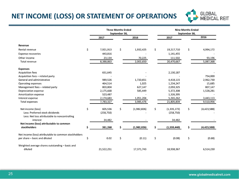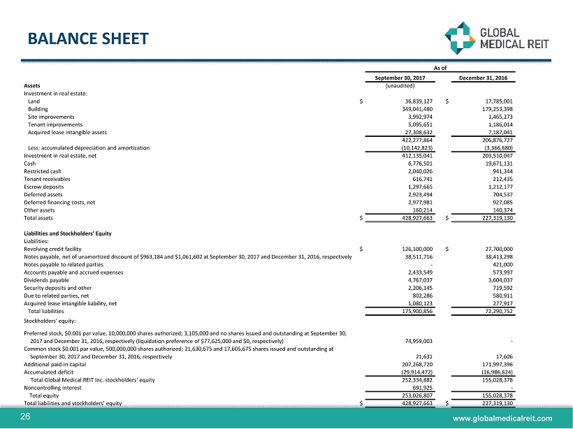www.globalmedicalreit.com NET INCOME (LOSS) OR STATEMENT OF OPERATIONS 25 Three Months Ended September 30, Nine Months Ended September 30, 2017 2016 2017 2016 Revenue Rental revenue $ 7,921,913 $ 1,932,425 $ 19,217,710 $ 4,994,172 Expense recoveries 443,816 - 1,141,455 - Other income 23,134 70,225 111,502 93,196 Total revenue 8,388,863 2,002,650 20,470,667 5,087,368 Expenses Acquisition fees 651,645 - 2,130,187 - Acquisition fees – related party - - - 754,000 General and administrative 989,526 1,720,651 4,418,115 2,962,730 Operating expenses 464,514 1,025 1,234,247 15,685 Management fees – related party 803,804 627,147 2,059,325 807,147 Depreciation expense 2,175,668 585,449 5,372,308 1,528,281 Amortization expense 523,487 - 1,326,395 - Interest expense 2,174,683 1,051,204 5,265,262 3,443,113 Total expenses 7,783,327 3,985,476 21,805,839 9,510,956 Net income (loss) $ 605,536 $ (1,982,826) $ (1,335,172) $ (4,423,588) Less: Preferred stock dividends (258,750) - (258,750) - Less: Net loss attributable to noncontrolling interest 34,482 - 34,482 - Net income (loss) attributable to common stockholders $ 381,268 $ (1,982,826) $ (1,559,440) $ (4,423,588) Net income (loss) attributable to common stockholders per share – basic and diluted $ 0.02 $ (0.11) $ (0.08) $ (0.68) Weighted average shares outstanding – basic and diluted 21,522,251 17,371,743 18,938,367 6,514,230