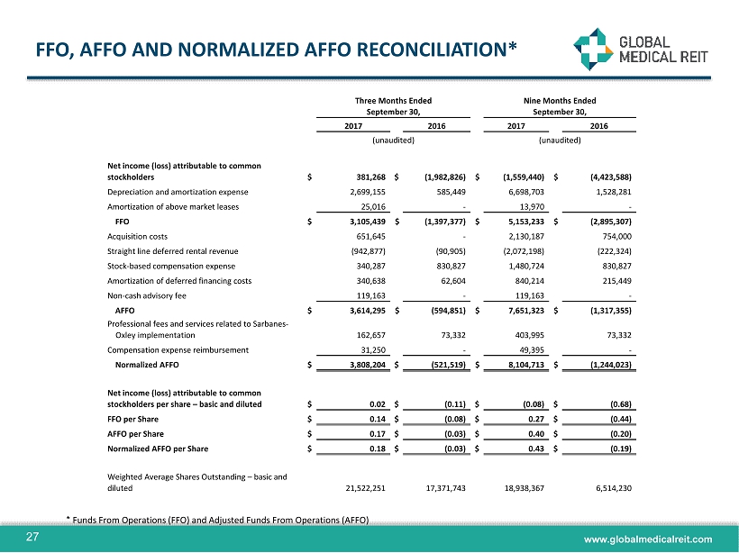 www.globalmedicalreit.com FFO , AFFO AND NORMALIZED AFFO RECONCILIATION* 27 Three Months Ended September 30, Nine Months Ended September 30, 2017 2016 2017 2016 (unaudited) (unaudited) Net income (loss) attributable to common stockholders $ 381,268 $ (1,982,826) $ (1,559,440) $ (4,423,588) Depreciation and amortization expense 2,699,155 585,449 6,698,703 1,528,281 Amortization of above market leases 25,016 - 13,970 - FFO $ 3,105,439 $ (1,397,377) $ 5,153,233 $ (2,895,307) Acquisition costs 651,645 - 2,130,187 754,000 Straight line deferred rental revenue (942,877) (90,905) (2,072,198) (222,324) Stock - based compensation expense 340,287 830,827 1,480,724 830,827 Amortization of deferred financing costs 340,638 62,604 840,214 215,449 Non - cash advisory fee 119,163 - 119,163 - AFFO $ 3,614,295 $ (594,851) $ 7,651,323 $ (1,317,355) Professional fees and services related to Sarbanes - Oxley implementation 162,657 73,332 403,995 73,332 Compensation expense reimbursement 31,250 - 49,395 - Normalized AFFO $ 3,808,204 $ (521,519) $ 8,104,713 $ (1,244,023) Net income (loss) attributable to common stockholders per share – basic and diluted $ 0.02 $ (0.11) $ (0.08) $ (0.68) FFO per Share $ 0.14 $ (0.08) $ 0.27 $ (0.44) AFFO per Share $ 0.17 $ (0.03) $ 0.40 $ (0.20) Normalized AFFO per Share $ 0.18 $ (0.03) $ 0.43 $ (0.19) Weighted Average Shares Outstanding – basic and diluted 21,522,251 17,371,743 18,938,367 6,514,230 * Funds From Operations (FFO and Adjusted Funds From Operations (AFFO)