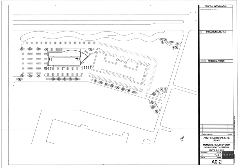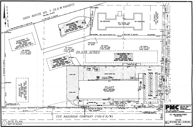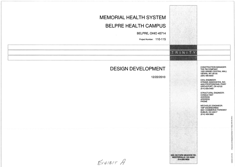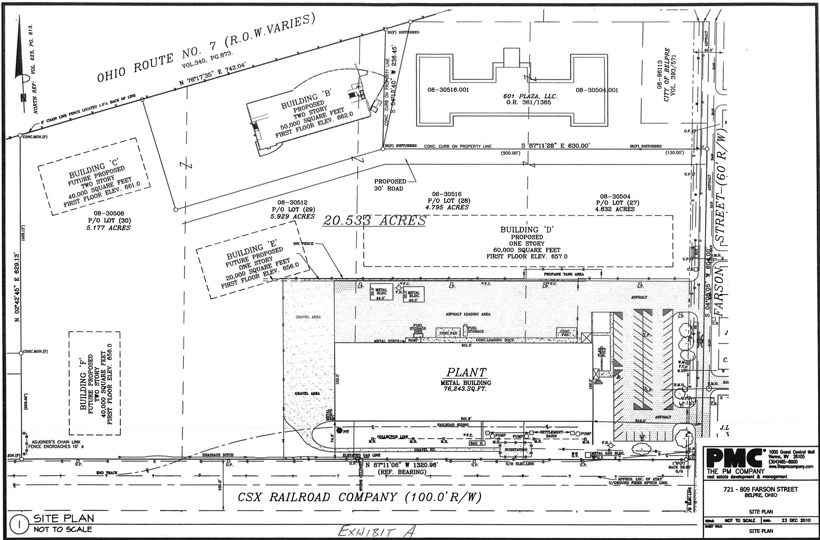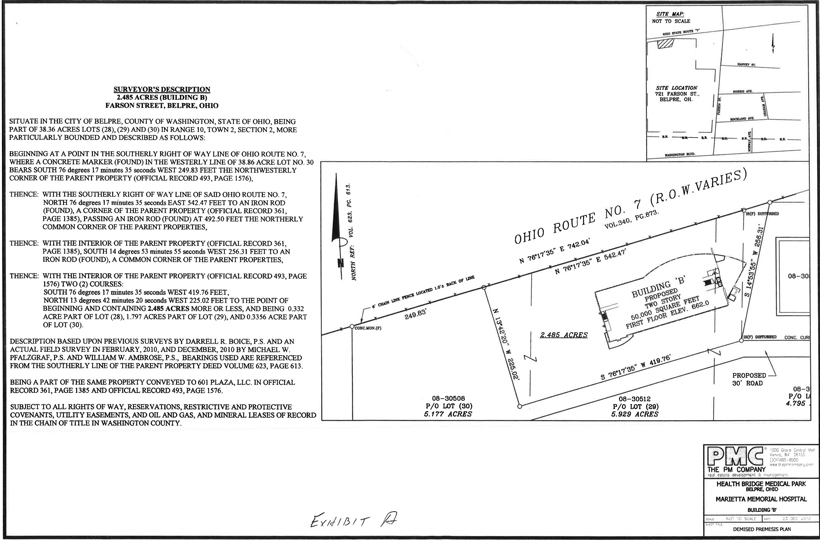 Section 1: The Demised Premises shall consist of and are described as the gross building area of 50,300 square feet, pursuant to the project design of the Trinity Health Group of the building (“Building”), to be located in the Health Bridge Medical Park, with the mailing address of 807 Farson Street, Belpre, Ohio 45714, together with the real estate upon which the Building shall be located, including parking lots and sidewalks thereon, all as shown on the plats and floor plans included in the plans and specifications hereinafter described to be attached hereto and made a part hereof as Exhibit A, being a part of the same real estate conveyed to Landlord by International Converter, LLC, a Delaware limited liability company, by Special Warranty Deed dated April 14, 2010, recorded in the Washington County, Ohio Recorder’s Office in Official Record 493, at Page 1576.