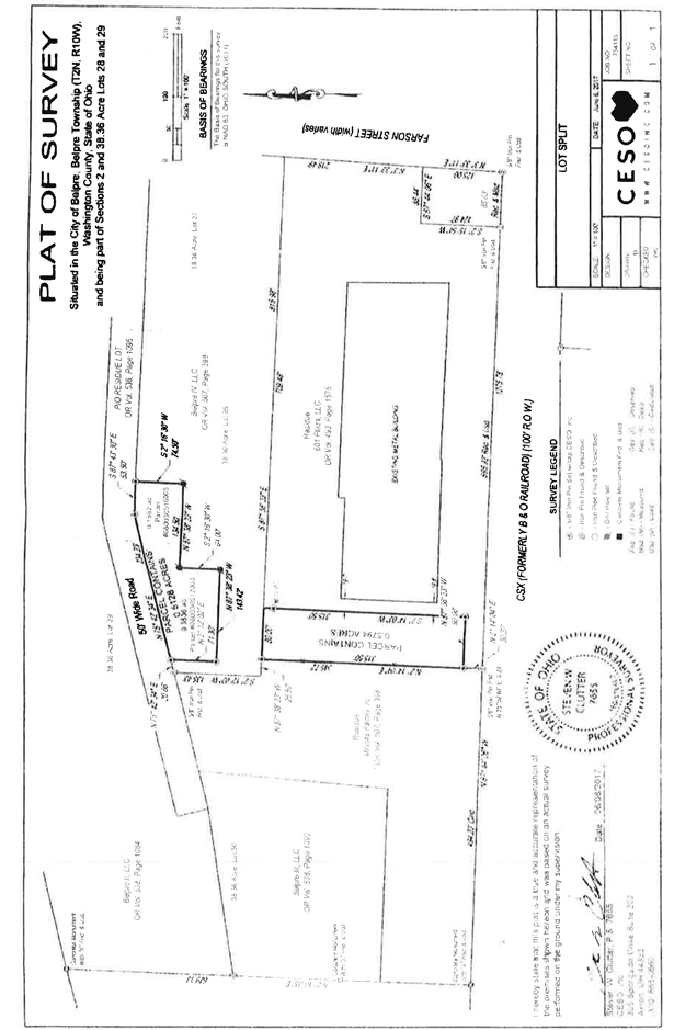 Situated in the City of Belpre, Belpre Township (T2N, R10W), Washington County, State of Ohio and being part of Sections 2 and 38.36 Acre Lots 28 and 29 and part of a parcel conveyed to Belpre IV, LLC by deed recorded in OR Vol. 507, Page 398 of the Washington County Recorder’s records and being further bounded and described as follows: