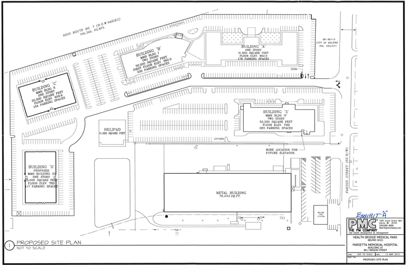 Section 1: The Demised Premises shall consist of and are described as the gross building area of 25,0 square feet, pursuant to the project design of the building (“Building”), to be located in the Health Bridge Medical Park, with the mailing address of 803 Farson Street, Belpre, Ohio 45714, together with the real estate upon which the Building shall be located, including parking lots and sidewalks thereon, all as shown on the plats and floor plans included in the plans and specifications hereinafter described to be attached hereto and made a part hereof as Exhibit A when completed, being a part of the same real estate conveyed to Landlord by Minnite Family, LLC, a West Virginia limited liability company, by i) General Warranty Deed dated January 10, 2013, recorded in the Washington County, Ohio Recorder’s Office in Official Record 538, at Page 1090 and ii) Correction General Warranty Deed dated July 14, 2015, recorded in said Recorder’s Office in Official Record 587, at Page 1694, less that certain tract of 0.329 acres conveyed by Landlord to the said Minnite Family, LLC, by quitclaim deed dated August 6, 2016, recorded in said Recorder’s Office in Official Record 587, at Page 1704.