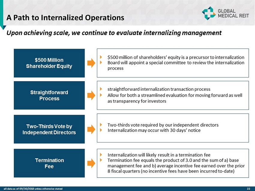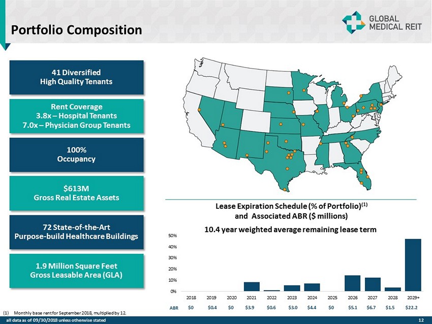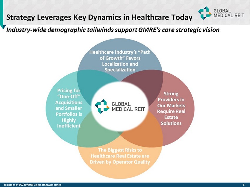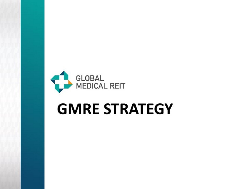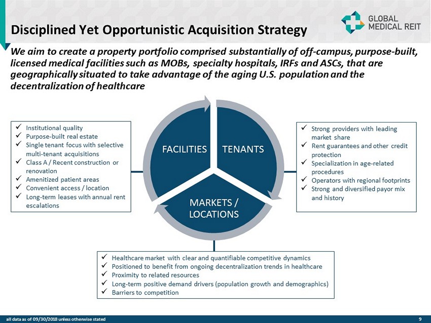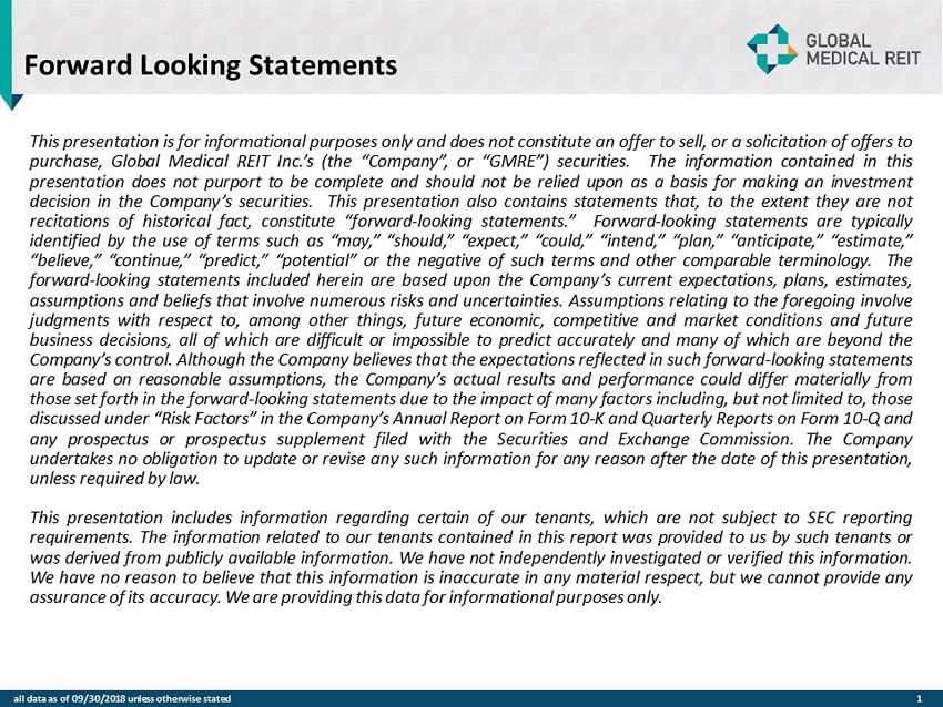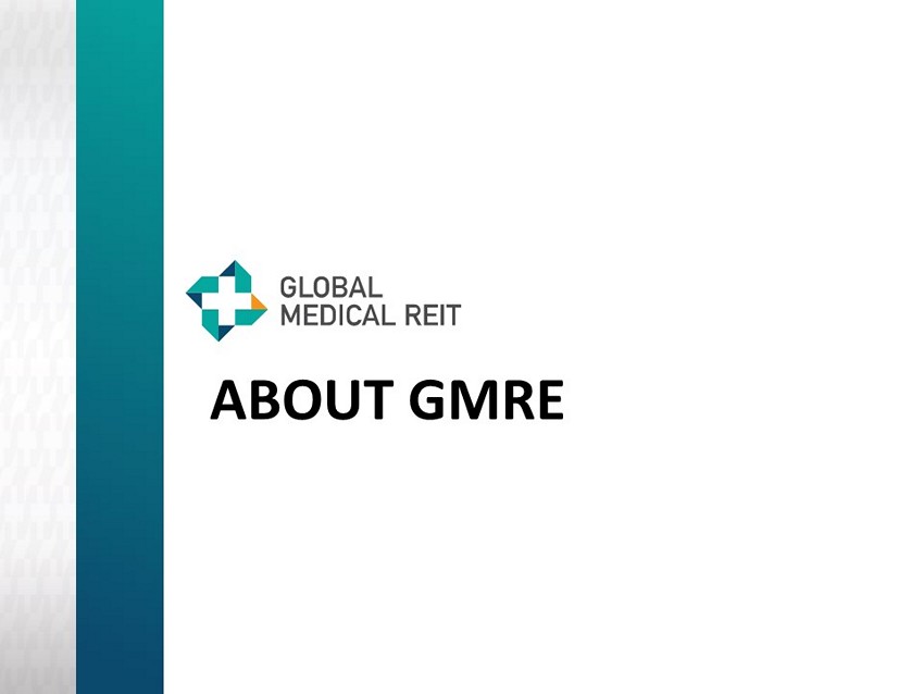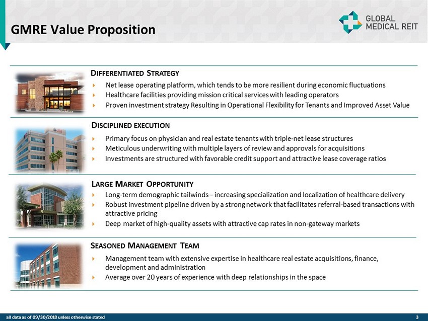 Forward Looking Statements 1 all data as of 09/30/2018 unless otherwise stated This presentation is for informational purposes only and does not constitute an offer to sell, or a solicitation of offers to purchase, Global Medical REIT Inc . ’s (the “Company”, or “GMRE”) securities . The information contained in this presentation does not purport to be complete and should not be relied upon as a basis for making an investment decision in the Company’s securities . This presentation also contains statements that, to the extent they are not recitations of historical fact, constitute “forward - looking statements . ” Forward - looking statements are typically identified by the use of terms such as “may,” “should,” “expect,” “could,” “intend,” “plan,” “anticipate,” “estimate,” “believe,” “continue,” “predict,” “potential” or the negative of such terms and other comparable terminology . The forward - looking statements included herein are based upon the Company’s current expectations, plans, estimates, assumptions and beliefs that involve numerous risks and uncertainties . Assumptions relating to the foregoing involve judgments with respect to, among other things, future economic, competitive and market conditions and future business decisions, all of which are difficult or impossible to predict accurately and many of which are beyond the Company’s control . Although the Company believes that the expectations reflected in such forward - looking statements are based on reasonable assumptions, the Company’s actual results and performance could differ materially from those set forth in the forward - looking statements due to the impact of many factors including, but not limited to, those discussed under “Risk Factors” in the Company’s Annual Report on Form 10 - K and Quarterly Reports on Form 10 - Q and any prospectus or prospectus supplement filed with the Securities and Exchange Commission . The Company undertakes no obligation to update or revise any such information for any reason after the date of this presentation, unless required by law . This presentation includes information regarding certain of our tenants, which are not subject to SEC reporting requirements . The information related to our tenants contained in this report was provided to us by such tenants or was derived from publicly available information . We have not independently investigated or verified this information . We have no reason to believe that this information is inaccurate in any material respect, but we cannot provide any assurance of its accuracy . We are providing this data for informational purposes only .