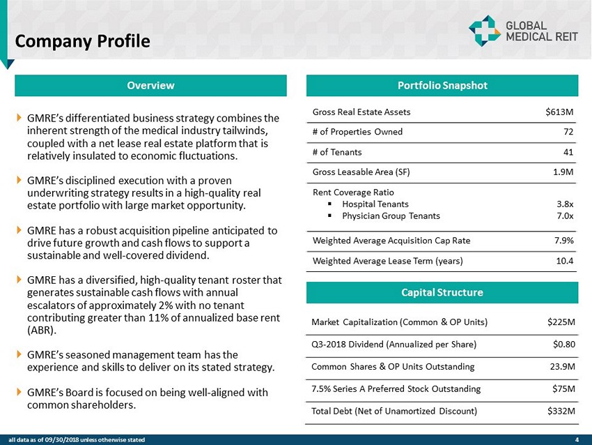 GMRE Value Proposition Net lease operating platform, which tends to be more resilient during economic fluctuations Healthcare facilities providing mission critical services with leading operators Proven investment strategy Resulting in Operational Flexibility for Tenants and Improved Asset Value D IFFERENTIATED S TRATEGY Primary focus on physician and real estate tenants with triple - net lease structures Meticulous underwriting with multiple layers of review and approvals for acquisitions Investments are structured with favorable credit support and attractive lease coverage ratios Long - term demographic tailwinds – increasing specialization and localization of healthcare delivery Robust investment pipeline driven by a strong network that facilitates referral - based transactions with attractive pricing Deep market of high - quality assets with attractive cap rates in non - gateway markets Management team with extensive expertise in healthcare real estate acquisitions, finance, development and administration Average over 20 years of experience with deep relationships in the space D ISCIPLINED EXECUTION L ARGE M ARKET O PPORTUNITY S EASONED M ANAGEMENT T EAM 3 all data as of 09/30/2018 unless otherwise stated