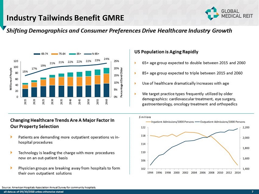 Strategy Leverages Key Dynamics in Healthcare Today Industry - wide demographic tailwinds support GMRE’s core strategic vision Healthcare Industry’s “Path of Growth” Favors Localization and Specialization Strong Providers in Our Markets Require Real Estate Solutions The Biggest Risks to Healthcare Real Estate are Driven by Operator Quality Pricing for “One - Off” Acquisitions and Smaller Portfolios is Highly Inefficient 6 all data as of 09/30/2018 unless otherwise stated