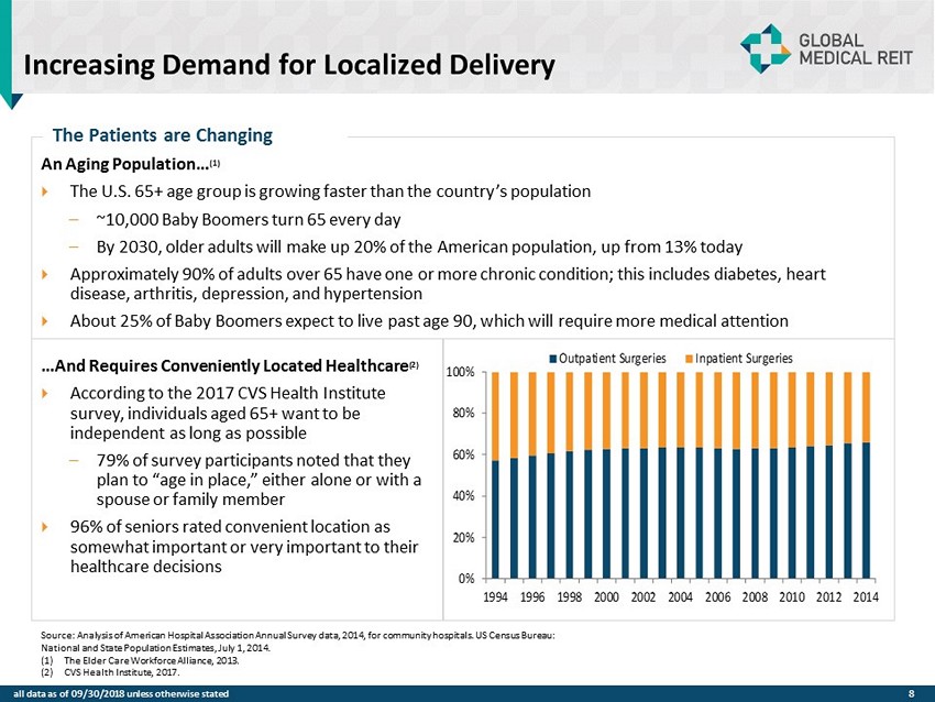 Shifting Demographics and Consumer Preferences Drive Healthcare Industry Growth Industry Tailwinds Benefit GMRE US Population is Aging Rapidly 65+ age group expected to double between 2015 and 2060 85+ age group expected to triple between 2015 and 2060 Use of healthcare dramatically increases with age We target practice types frequently utilized by older demographics: cardiovascular treatment, eye surgery, gastroenterology, oncology treatment and orthopedics Changing Healthcare Trends Are A Major Factor In Our Property Selection Patients are demanding more outpatient operations vs in - hospital procedures Technology is leading the charge with more procedures now on an out - patient basis Physician groups are breaking away from hospitals to form their own outpatient solutions 15% 17% 19% 21% 21% 22% 22% 22% 23% 24% 0% 5% 10% 15% 20% 25% 0 20 40 60 80 100 120 2015 2020 2025 2030 2035 2040 2045 2050 2055 2060 Percentage 65 and Older Millions of People 65-74 75-84 85+ % 65+ Source: American Hospitals Association Annual Survey for community hospitals. $ millions 7 all data as of 09/30/2018 unless otherwise stated