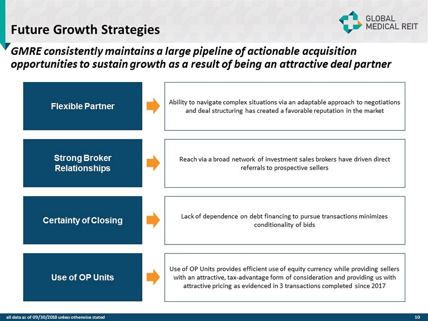 Disciplined Yet Opportunistic Acquisition Strategy We aim to create a property portfolio comprised substantially of off - campus, purpose - built, licensed medical facilities such as MOBs, specialty hospitals, IRFs and ASCs, that are geographically situated to take advantage of the aging U.S. population and the decentralization of healthcare TENANTS MARKETS / LOCATIONS FACILITIES x Strong providers with leading market share x Rent guarantees and other credit protection x Specialization in age - related procedures x Operators with regional footprints x Strong and diversified payor mix and history x Institutional quality x Purpose - built real estate x Single tenant focus with selective multi - tenant acquisitions x Class A / Recent construction or renovation x Amenitized patient areas x Convenient access / location x Long - term leases with annual rent escalations x Healthcare market with clear and quantifiable competitive dynamics x Positioned to benefit from ongoing decentralization trends in healthcare x Proximity to related resources x Long - term positive demand drivers (population growth and demographics) x Barriers to competition 9 all data as of 09/30/2018 unless otherwise stated