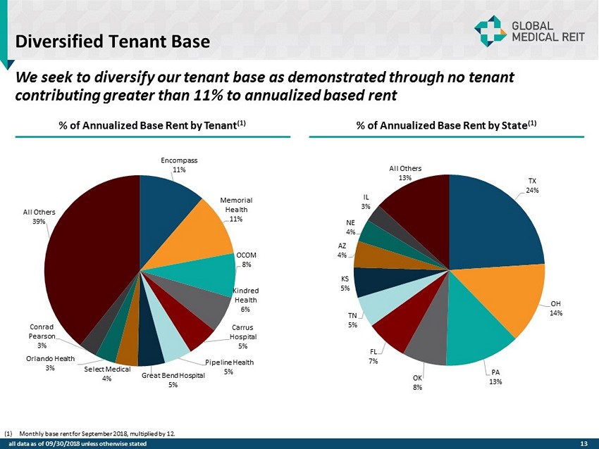 Portfolio Composition (1) Monthly base rent for September 2018, multiplied by 12. $ 613M Gross Real Estate Assets 72 State - of - the - Art Purpose - build Healthcare Buildings Rent Coverage 3.8x – Hospital Tenants 7.0x – Physician Group Tenants 100% Occupancy 1.9 Million Square Feet Gross Leasable Area (GLA) 41 Diversified High Quality Tenants Lease Expiration Schedule (% of Portfolio) (1) and Associated ABR ($ millions) 10.4 year weighted average remaining lease term 12 all data as of 09/30/2018 unless otherwise stated 0% 10% 20% 30% 40% 50% 2018 2019 2020 2021 2022 2023 2024 2025 2026 2027 2028 2029+ $0 $0.4 $0 $3.9 $0.6 $3.0 $4.4 $0 $5.1 $6.7 $1.5 $22.2 ABR