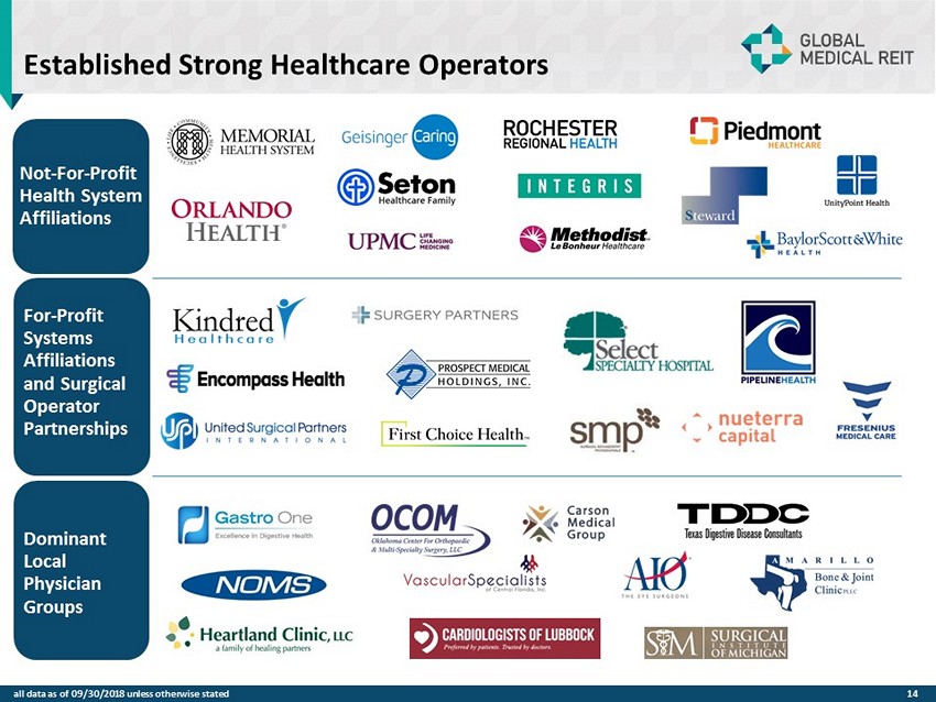 Diversified Tenant Base (1) Monthly base rent for September 2018, multiplied by 12. % of Annualized Base Rent by State (1) % of Annualized Base Rent by Tenant (1) We seek to diversify our tenant base as demonstrated through no tenant contributing greater than 11% to annualized based rent 13 all data as of 09/30/2018 unless otherwise stated Encompass 11% Memorial Health 11% OCOM 8% Kindred Health 6% Carrus Hospital 5% Pipeline Health 5% Great Bend Hospital 5% Select Medical 4% Orlando Health 3% Conrad Pearson 3% All Others 39% TX 24% OH 14% PA 13% OK 8% FL 7% TN 5% KS 5% AZ 4% NE 4% IL 3% All Others 13%