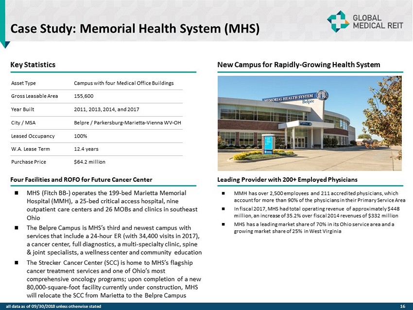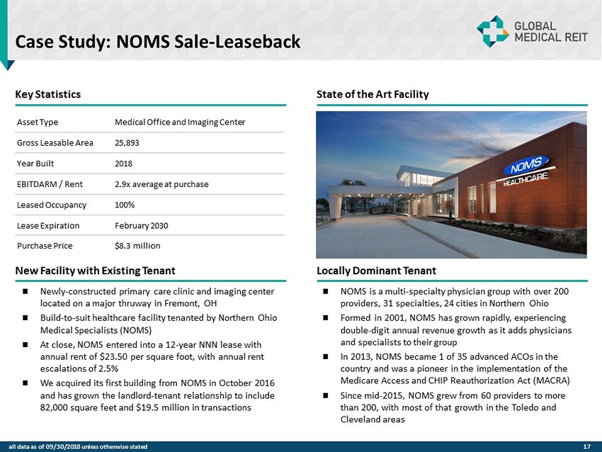 Case Study: Memorial Health System (MHS) Key Statistics New Campus for Rapidly - Growing Health System Four Facilities and ROFO for Future Cancer Center Leading Provider with 200+ Employed Physicians MHS (Fitch BB - ) operates the 199 - bed Marietta Memorial Hospital (MMH), a 25 - bed critical access hospital, nine outpatient care centers and 26 MOBs and clinics in southeast Ohio The Belpre Campus is MHS’s third and newest campus with services that include a 24 - hour ER (with 34,400 visits in 2017), a cancer center, full diagnostics, a multi - specialty clinic, spine & joint specialists, a wellness center and community education The Strecker Cancer Center (SCC) is home to MHS’s flagship cancer treatment services and one of Ohio’s most comprehensive oncology programs; upon completion of a new 80,000 - square - foot facility currently under construction, MHS will relocate the SCC from Marietta to the Belpre Campus MMH has over 2,500 employees and 211 accredited physicians, which account for more than 90% of the physicians in their Primary Service Area In fiscal 2017, MHS had total operating revenue of approximately $448 million, an increase of 35.2% over fiscal 2014 revenues of $332 million MHS has a leading market share of 70% in its Ohio service area and a growing market share of 25% in West Virginia Asset Type Campus with four Medical Office Buildings Gross Leasable Area 155 ,600 Year Built 2011, 2013, 2014, and 2017 City / MSA Belpre / Parkersburg - Marietta - Vienna WV - OH Leased Occupancy 100% W.A. Lease Term 1 2 .4 years Purchase Price $ 64 .2 million 16 all data as of 09/30/2018 unless otherwise stated