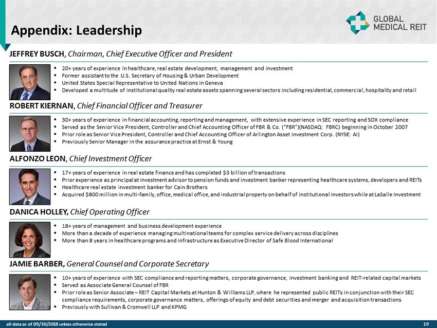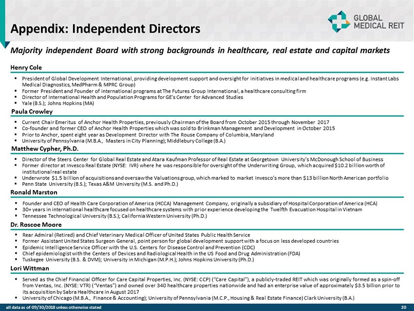 Appendix: Leadership JEFFREY BUSCH , Chairman, Chief Executive Officer and President ROBERT KIERNAN , Chief Financial Officer and Treasurer ALFONZO LEON , Chief Investment Officer ▪ 17 + years of experience in real estate finance and has completed $ 3 billion of transactions ▪ Prior experience as principal at investment advisor to pension funds and investment banker representing healthcare systems, d eve lopers and REITs ▪ Healthcare real estate investment banker for Cain Brothers ▪ Acquired $ 800 million in multi - family, office, medical office, and industrial property on behalf of institutional investors while at LaSalle Investment DANICA HOLLEY, Chief Operating Officer ▪ 18 + years of management and business development experience ▪ More than a decade of experience managing multinational teams for complex service delivery across disciplines ▪ More than 8 years in healthcare programs and infrastructure as Executive Director of Safe Blood International ▪ 10+ years of experience with SEC compliance and reporting matters, corporate governance, investment banking and REIT - related ca pital markets ▪ Served as Associate General Counsel of FBR ▪ Prior role as Senior Associate – REIT Capital Markets at Hunton & Williams LLP, where he represented public REITs in conjunction with their SEC compliance requirements, corporate governance matters, offerings of equity and debt securities and merger and acquisition tra nsa ctions ▪ Previously with Sullivan & Cromwell LLP and KPMG JAMIE BARBER, General Counsel and Corporate Secretary ▪ 20+ years of experience in healthcare, real estate development, management and investment ▪ Former assistant to the U.S. Secretary of Housing & Urban Development ▪ United States Special Representative to United Nations in Geneva ▪ Developed a multitude of institutional quality real estate assets spanning several sectors including residential, commercial, ho spitality and retail ▪ 30+ years of experience in financial accounting, reporting and management, with extensive experience in SEC reporting and SOX co mpliance ▪ Served as the Senior Vice President, Controller and Chief Accounting Officer of FBR & Co. (“FBR”)(NASDAQ: FBRC) beginning in Oct ober 2007 ▪ Prior role as Senior Vice President, Controller and Chief Accounting Officer of Arlington Asset Investment Corp. (NYSE: AI) ▪ Previously Senior Manager in the assurance practice at Ernst & Young 19 all data as of 09/30/2018 unless otherwise stated