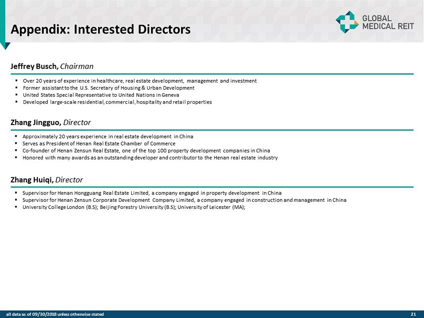 Appendix: Independent Directors Majority independent Board with strong backgrounds in healthcare, real estate and capital markets Henry Cole ▪ President of Global Development International, providing development support and oversight for initiatives in medical and hea lth care programs (e.g. Instant Labs Medical Diagnostics, MedPharm & MPRC Group) ▪ Former President and Founder of international programs at The Futures Group International, a healthcare consulting firm ▪ Director of International Health and Population Programs for GE’s Center for Advanced Studies ▪ Yale (B.S.); Johns Hopkins (MA) Matthew Cypher, Ph.D. ▪ Director of the Steers Center for Global Real Estate and Atara Kaufman Professor of Real Estate at Georgetown University’s McDonough School of Business ▪ Former director at Invesco Real Estate (NYSE: IVR) where he was responsible for oversight of the Underwriting Group, which ac qui red $10.2 billion worth of institutional real estate ▪ Underwrote $1.5 billion of acquisitions and oversaw the Valuations group, which marked to market Invesco’s more than $13 bill ion North American portfolio ▪ Penn State University (B.S.); Texas A&M University (M.S. and Ph.D.) Lori Wittman ▪ Served as the Chief Financial Officer for Care Capital Properties, Inc . (NYSE : CCP) (“Care Capital”), a publicly - traded REIT which was originally formed as a spin - off from Ventas, Inc . (NYSE : VTR) (“Ventas”) and owned over 340 healthcare properties nationwide and had an enterprise value of approximately $ 3 . 5 billion prior to its acquisition by Sabra Healthcare in August 2017 ▪ University of Chicago (M . B . A . , Finance & Accounting) ; University of Pennsylvania (M . C . P . , Housing & Real Estate Finance) Clark University (B . A . ) Ronald Marston ▪ Founder and CEO of Health Care Corporation of America (HCCA) Management Company, originally a subsidiary of Hospital Corporation of America (HCA) ▪ 30 + years in international healthcare focused on healthcare systems with prior experience developing the Twelfth Evacuation Hospital in Vietnam ▪ Tennessee Technological University (B . S . ) ; California Western University (Ph . D . ) ▪ Rear Admiral (Retired) and Chief Veterinary Medical Officer of United States Public Health Service ▪ Former Assistant United States Surgeon General, point person for global development support with a focus on less developed countries ▪ Epidemic Intelligence Service Officer with the U . S . Centers for Disease Control and Prevention (CDC) ▪ Chief epidemiologist with the Centers of Devices and Radiological Health in the US Food and Drug Administration (FDA) ▪ Tuskegee University (B . S . & DVM) ; University in Michigan (M . P . H . ) ; Johns Hopkins University (Ph . D . ) Dr. Roscoe Moore Paula Crowley ▪ Current Chair Emeritus of Anchor Health Properties, previously Chairman of the Board from October 2015 through November 2017 ▪ Co - founder and former CEO of Anchor Health Properties which was sold to Brinkman Management and Development in October 2015 ▪ Prior to Anchor, spent eight year as Development Director with The Rouse Company of Columbia, Maryland ▪ University of Pennsylvania (M.B.A., Masters in City Planning); Middlebury College (B.A.) 20 all data as of 09/30/2018 unless otherwise stated