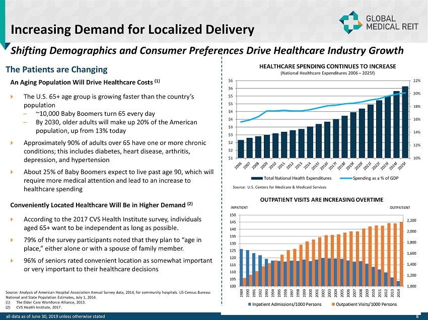 GMRE Benefits From Key Dynamics in Healthcare Industry - wide demographic tailwinds support GMRE’s core strategic vision Healthcare Providers Diversifying Real Estate Strategies to Capture Growing Patient Demand Physicians Forming Groups and Moving to Suburban Communities Technology Will Continue to Push More Healthcare to Outpatient Settings Aging Population Creates More Outpatient Procedures and Driving Patient Demand 5