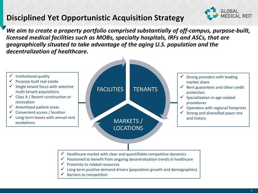 Increasing Demand for Localized Delivery An Aging Population Will Drive Healthcare Costs (1) The U.S. 65+ age group is growing faster than the country’s population – ~10,000 Baby Boomers turn 65 every day – By 2030, older adults will make up 20% of the American population, up from 13% today Approximately 90% of adults over 65 have one or more chronic conditions; this includes diabetes, heart disease, arthritis, depression, and hypertension About 25% of Baby Boomers expect to live past age 90, which will require more medical attention and lead to an increase to healthcare spending The Patients are Changing Source: Analysis of American Hospital Association Annual Survey data, 2014, for community hospitals. US Census Bureau: National and State Population Estimates, July 1, 2014. (1) The Elder Care Workforce Alliance, 2013. (2) CVS Health Institute, 2017. Conveniently Located Healthcare Will Be in Higher Demand (2) According to the 2017 CVS Health Institute survey, individuals aged 65+ want to be independent as long as possible. 79% of the survey participants noted that they plan to “age in place,” either alone or with a spouse of family member. 96% of seniors rated convenient location as somewhat important or very important to their healthcare decisions 6 1,000 1,200 1,400 1,600 1,800 2,000 2,200 100 105 110 115 120 125 130 135 140 145 150 1989 1990 1991 1992 1993 1994 1995 1996 1997 1998 1999 2000 2001 2002 2003 2004 2005 2006 2007 2008 2009 2010 2011 2012 2013 2014 OUTPATIENT VISITS ARE INCREASING OVERTIME Inpatient Admissions/1000 Persons Outpatient Visits/1000 Persons INPATIENT OUTPATIENT 10% 12% 14% 16% 18% 20% 22% $1 $2 $2 $3 $3 $4 $4 $5 $5 $6 $6 Total National Health Expenditures Spending as a % of GDP Source: U.S. Centers for Medicare & Medicaid Services HEALTHCARE SPENDING CONTINUES TO INCREASE (National Healthcare Expenditures 2006 – 2025f) Shifting Demographics and Consumer Preferences Drive Healthcare Industry Growth all data as of June 30, 2019 unless otherwise stated
