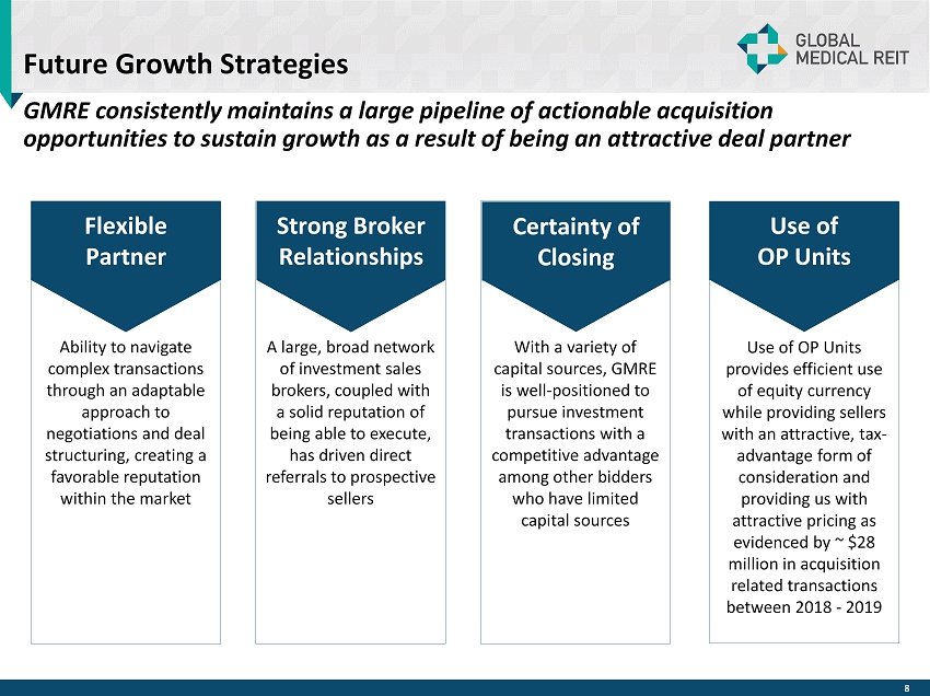 Disciplined Yet Opportunistic Acquisition Strategy We aim to create a property portfolio comprised substantially of off - campus, purpose - built, licensed medical facilities such as MOBs, specialty hospitals, IRFs and ASCs, that are geographically situated to take advantage of the aging U.S. population and the decentralization of healthcare. TENANTS MARKETS / LOCATIONS FACILITIES x Strong providers with leading market share x Rent guarantees and other credit protection x Specialization in age - related procedures x Operators with regional footprints x Strong and diversified payor mix and history x Institutional quality x Purpose - built real estate x Single tenant focus with selective multi - tenant acquisitions x Class A / Recent construction or renovation x Amenitized patient areas x Convenient access / location x Long - term leases with annual rent escalations x Healthcare market with clear and quantifiable competitive dynamics x Positioned to benefit from ongoing decentralization trends in healthcare x Proximity to related resources x Long - term positive demand drivers (population growth and demographics) x Barriers to competition 7
