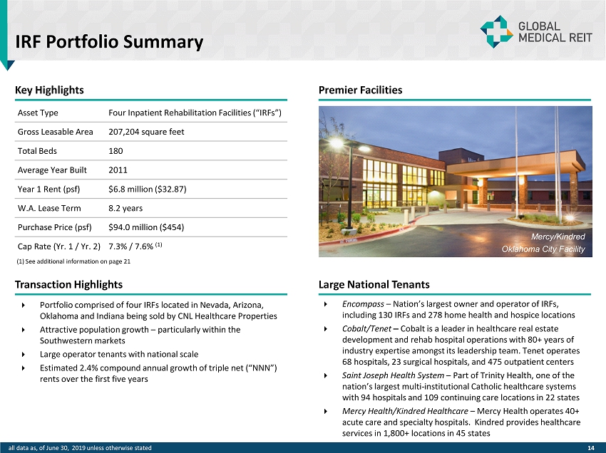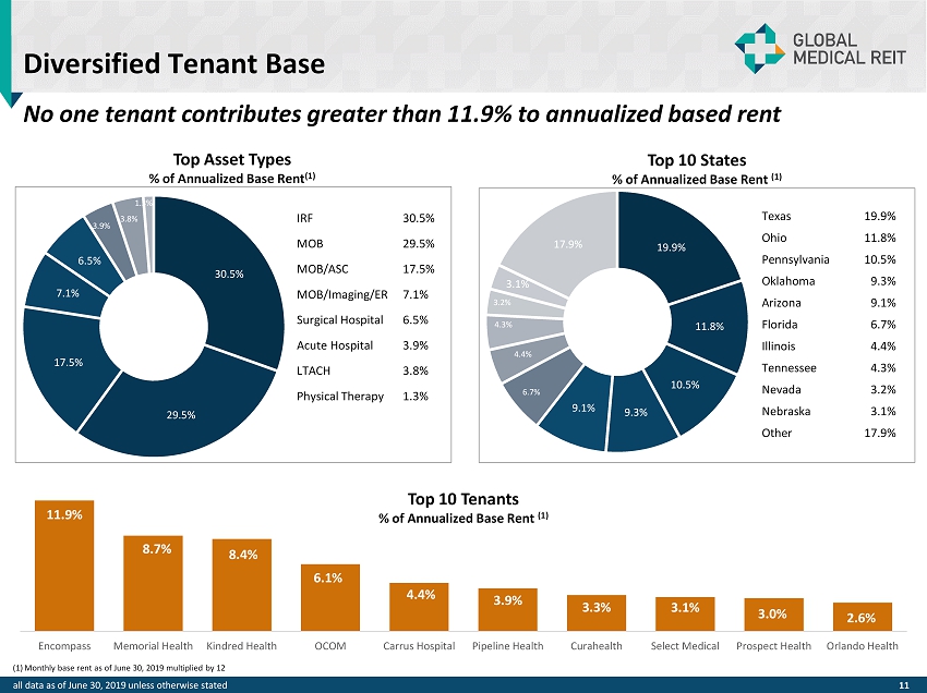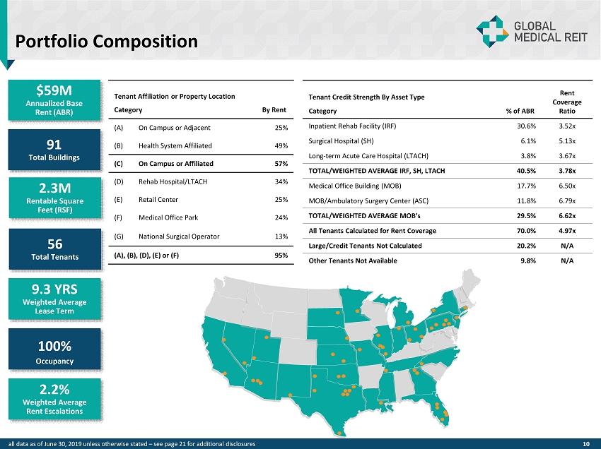 Portfolio Composition 2.2% Weighted Average Rent Escalations 91 Total Buildings 9.3 YRS Weighted Average Lease Term 100% Occupancy 2.3M Rentable Square Feet (RSF) 56 Total Tenants 10 Lease Expiration Schedule (% of Portfolio) (1) and Associated ABR ($ millions) 10.4 year weighted average remaining lease term Tenant Affiliation or Property Location Category By Rent (A) On Campus or Adjacent 25% (B) Health System Affiliated 49% (C) On Campus or Affiliated 57% (D) Rehab Hospital/LTACH 34% (E) Retail Center 25% (F) Medical Office Park 24% (G) National Surgical Operator 13% (A), (B), (D), (E) or (F) 95% Tenant Credit Strength By Asset Type Category % of ABR Rent Coverage Ratio Inpatient Rehab Facility (IRF) 30.6% 3.52x Surgical Hospital (SH) 6.1% 5.13x Long - term Acute Care Hospital (LTACH) 3.8% 3.67x TOTAL/WEIGHTED AVERAGE IRF, SH, LTACH 40.5% 3.78x Medical Office Building (MOB) 17.7% 6.50x MOB/Ambulatory Surgery Center (ASC) 11.8% 6.79x TOTAL/WEIGHTED AVERAGE MOB’s 29.5% 6.62x All Tenants Calculated for Rent Coverage 70.0% 4.97x Large/Credit Tenants Not Calculated 20.2% N/A Other Tenants Not Available 9.8% N/A $59M Annualized Base Rent (ABR) all data as of June 30, 2019 unless otherwise stated – see page 21 for additional disclosures