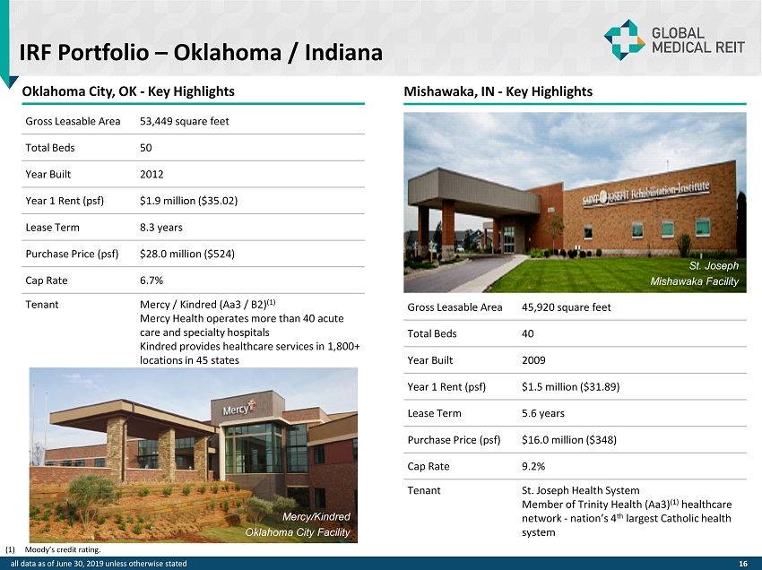 Las Vegas, NV - Key Highlights Surprise, AZ - Key Highlights Gross Leasable Area 53,260 square feet Total Beds 50 Year Built 2007 Year 1 Rent ( psf ) $1.5 million ($28.24) Lease Term 6.0 years Purchase Price ( psf ) $21.5 million ($404) Cap Rate 7.0% Tenant Encompass (Ba3) (1) Largest owner and operator of IRFs in the U.S. Gross Leasable Area 54,575 square feet Total Beds 40 Year Built 2015 Year 1 Rent ( psf ) $2.0 million ($36.12) Lease Term 11.6 years Purchase Price ( psf ) $28.5 million ($522) Cap Rate 6.9% Tenant Cobalt / Tenet (NR / Ba3) (1) Cobalt has 80+ years combined experience in healthcare real estate development Tenet operates 68 hospitals, 23 surgical hospitals, and 475 outpatient centers (1) Moody’s credit rating. all data as of May 31, 2019 unless otherwise stated 15 IRF Portfolio – Nevada / Arizona Encompass Nevada Facility Cobalt - Tenet Arizona Facility