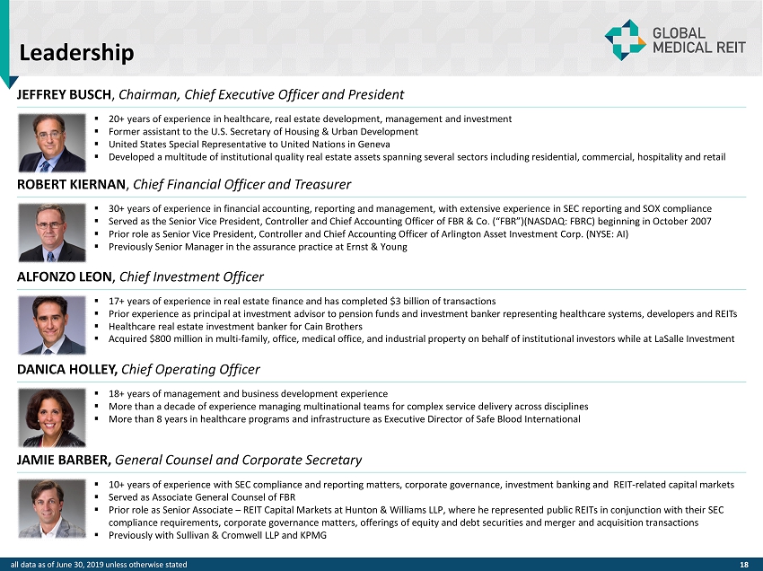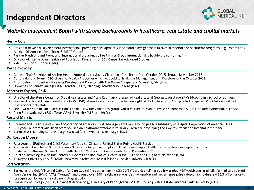 Leadership JEFFREY BUSCH , Chairman, Chief Executive Officer and President ROBERT KIERNAN , Chief Financial Officer and Treasurer ALFONZO LEON , Chief Investment Officer ▪ 17 + years of experience in real estate finance and has completed $ 3 billion of transactions ▪ Prior experience as principal at investment advisor to pension funds and investment banker representing healthcare systems, d eve lopers and REITs ▪ Healthcare real estate investment banker for Cain Brothers ▪ Acquired $ 800 million in multi - family, office, medical office, and industrial property on behalf of institutional investors while at LaSalle Investment DANICA HOLLEY, Chief Operating Officer ▪ 18 + years of management and business development experience ▪ More than a decade of experience managing multinational teams for complex service delivery across disciplines ▪ More than 8 years in healthcare programs and infrastructure as Executive Director of Safe Blood International ▪ 10+ years of experience with SEC compliance and reporting matters, corporate governance, investment banking and REIT - related ca pital markets ▪ Served as Associate General Counsel of FBR ▪ Prior role as Senior Associate – REIT Capital Markets at Hunton & Williams LLP, where he represented public REITs in conjunction with their SEC compliance requirements, corporate governance matters, offerings of equity and debt securities and merger and acquisition tra nsa ctions ▪ Previously with Sullivan & Cromwell LLP and KPMG JAMIE BARBER, General Counsel and Corporate Secretary ▪ 20+ years of experience in healthcare, real estate development, management and investment ▪ Former assistant to the U.S. Secretary of Housing & Urban Development ▪ United States Special Representative to United Nations in Geneva ▪ Developed a multitude of institutional quality real estate assets spanning several sectors including residential, commercial, ho spitality and retail ▪ 30+ years of experience in financial accounting, reporting and management, with extensive experience in SEC reporting and SOX co mpliance ▪ Served as the Senior Vice President, Controller and Chief Accounting Officer of FBR & Co. (“FBR”)(NASDAQ: FBRC) beginning in Oct ober 2007 ▪ Prior role as Senior Vice President, Controller and Chief Accounting Officer of Arlington Asset Investment Corp. (NYSE: AI) ▪ Previously Senior Manager in the assurance practice at Ernst & Young 18 all data as of June 30, 2019 unless otherwise stated