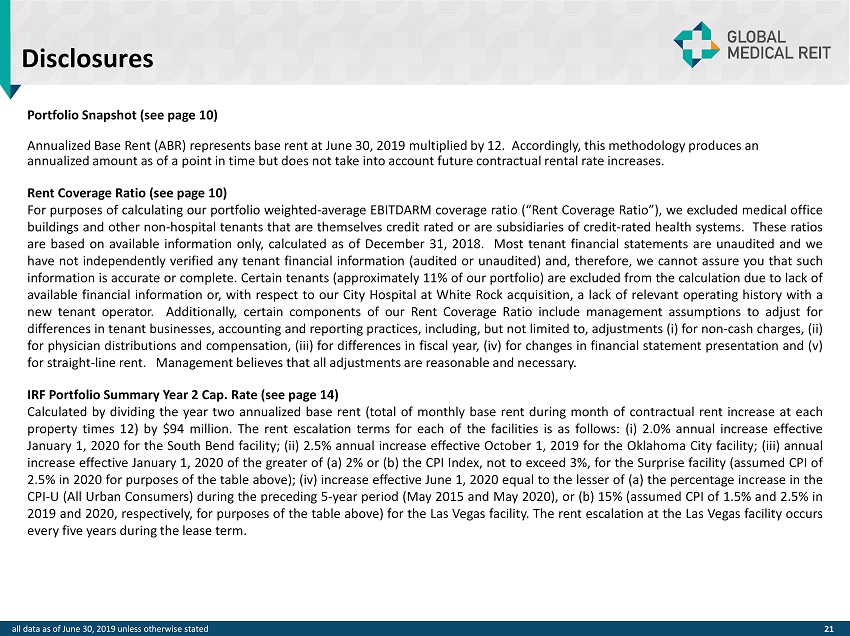 Disclosures 21 Portfolio Snapshot (see page 10 ) Annualized Base Rent (ABR) represents base rent at June 30, 2019 multiplied by 12 . Accordingly, this methodology produces an annualized amount as of a point in time but does not take into account future contractual rental rate increases. Rent Coverage Ratio (see page 10 ) For purposes of calculating our portfolio weighted - average EBITDARM coverage ratio (“Rent Coverage Ratio”), we excluded medical office buildings and other non - hospital tenants that are themselves credit rated or are subsidiaries of credit - rated health systems . These ratios are based on available information only, calculated as of December 31 , 2018 . Most tenant financial statements are unaudited and we have not independently verified any tenant financial information (audited or unaudited) and, therefore, we cannot assure you that such information is accurate or complete . Certain tenants (approximately 11 % of our portfolio) are excluded from the calculation due to lack of available financial information or, with respect to our City Hospital at White Rock acquisition, a lack of relevant operating history with a new tenant operator . Additionally, certain components of our Rent Coverage Ratio include management assumptions to adjust for differences in tenant businesses, accounting and reporting practices, including, but not limited to, adjustments ( i ) for non - cash charges, (ii) for physician distributions and compensation, (iii) for differences in fiscal year, (iv) for changes in financial statement presentation and (v) for straight - line rent . Management believes that all adjustments are reasonable and necessary . IRF Portfolio Summary Year 2 Cap . Rate (see page 14 ) Calculated by dividing the year two annualized base rent (total of monthly base rent during month of contractual rent increase at each property times 12 ) by $ 94 million . The rent escalation terms for each of the facilities is as follows : ( i ) 2 . 0 % annual increase effective January 1 , 2020 for the South Bend facility ; (ii) 2 . 5 % annual increase effective October 1 , 2019 for the Oklahoma City facility ; (iii) annual increase effective January 1 , 2020 of the greater of (a) 2 % or (b) the CPI Index, not to exceed 3 % , for the Surprise facility (assumed CPI of 2 . 5 % in 2020 for purposes of the table above) ; (iv) increase effective June 1 , 2020 equal to the lesser of (a) the percentage increase in the CPI - U (All Urban Consumers) during the preceding 5 - year period (May 2015 and May 2020 ), or (b) 15 % (assumed CPI of 1 . 5 % and 2 . 5 % in 2019 and 2020 , respectively, for purposes of the table above) for the Las Vegas facility . The rent escalation at the Las Vegas facility occurs every five years during the lease term . all data as of June 30, 2019 unless otherwise stated