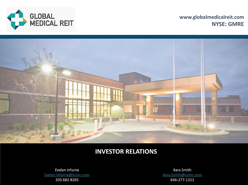 www.globalmedicalreit.com NYSE: GMRE Evelyn Infurna Evelyn.Infurna@icrinc.com 203.682.8265 Kara Smith Kara.Smith@icrinc.com 646 - 277 - 1211 INVESTOR RELATIONS